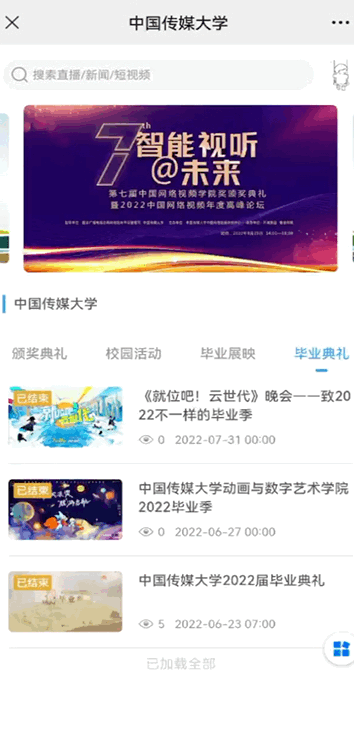 直播板块为在校师生和社会人士提供各式各样精彩的校园直播。在这里,可以看到一年一度的毕业典礼和开学典礼,各个学院的毕业展映,丰富多彩的校园活动,精彩绝伦的直播触手可看。