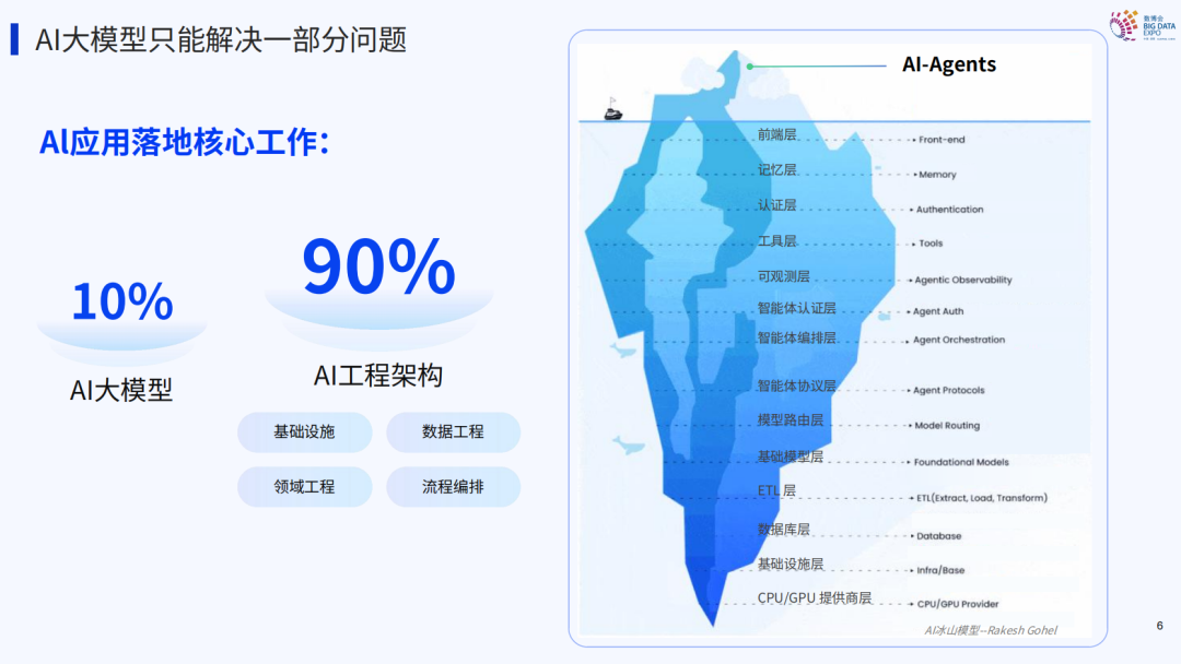 罗引指出,企业级AI应用落地看似是模型能力问题,实则是AI工程建设问题。他借“冰山模型”形象比喻这一现象:AI模型只是水面之上的10%,而真正决定能否落地的90%,来自底层的数据治理、工程架构与业务融合能力。