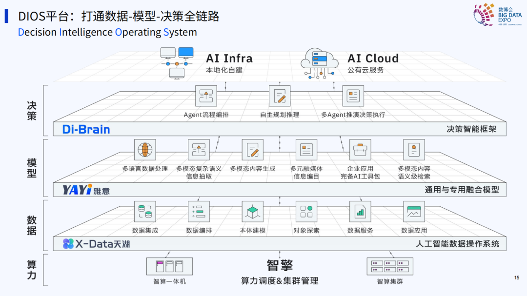 针对以上问题,中科闻歌自研企业级AI平台——DIOS决策智能操作系统,以“数据—模型—决策”三层架构为核心,打通AI应用的全链路闭环: