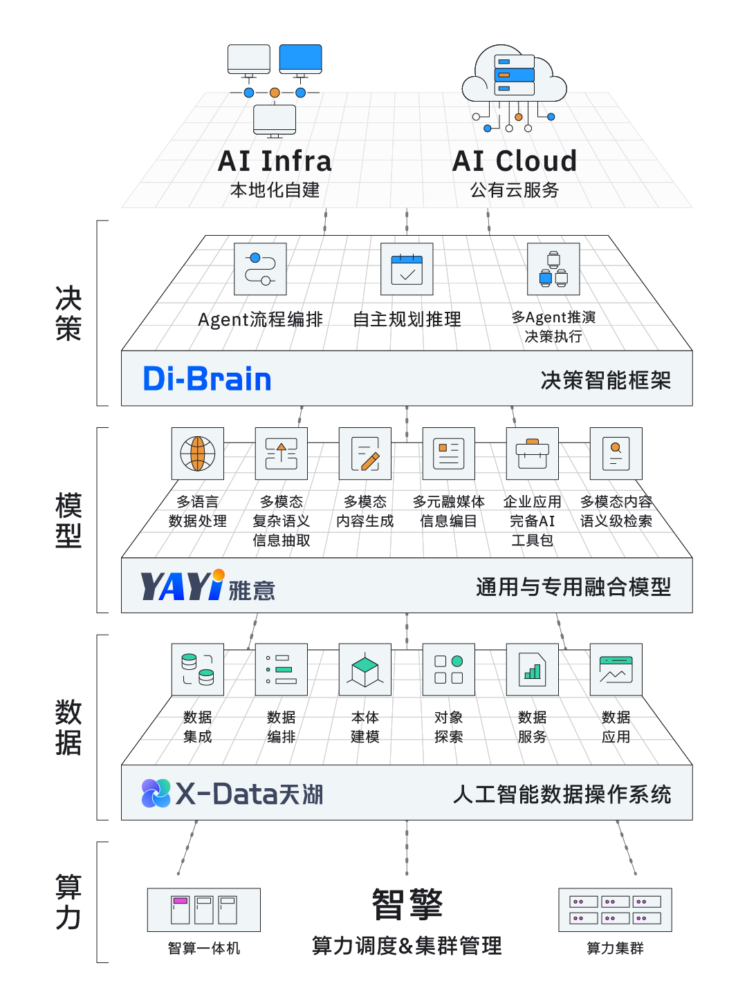 ▍数据层:通过本体建模、数据对象化、数据编排等技术,将企业真实业务抽象为AI可调用的结构化数据资源,支撑模型训练、知识问答、智能体执行等多类场景。