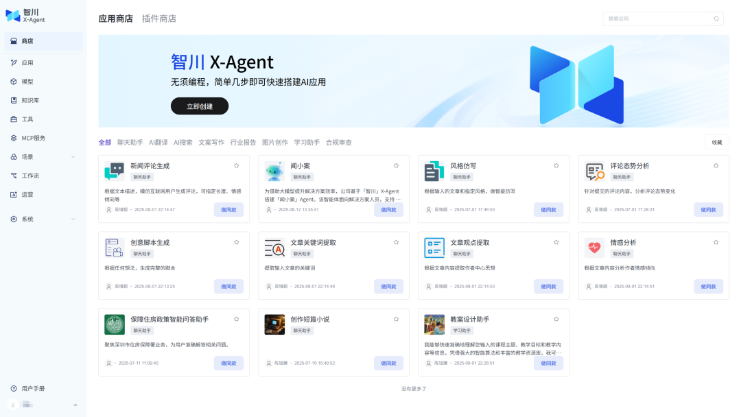 ▍决策层:构建智川X-Agent智能体平台,实现智能体自主决策、工具调用与多智能体协同仿真,为政务、金融、科研等复杂业务提供任务执行与动态决策能力。
